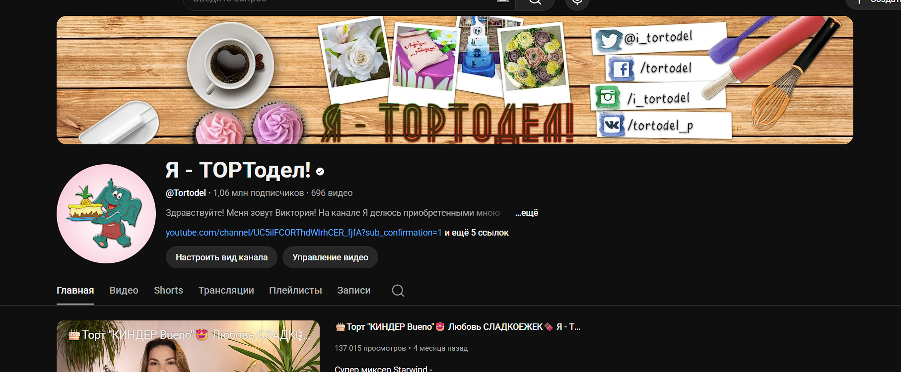 Канал "Я – ТОРТодел!" посвящён искусству создания и оформлению тортов, где автор Виктория делится своими профессиональными навыками, оригинальными рецептами начинок и техниками кондитерского декора. Тематика охватывает широкий спектр кондитерского мастерства — от простых домашних тортов до эффектных многоярусных и муссовых изделий, доступных для повторения даже без специального образования. Контент создавался на протяжении более восьми лет, включает свыше 600 видео и адресован как начинающим кондитерам, так и тем, кто хочет расширить своё мастерство и радовать близких уникальными тортами.