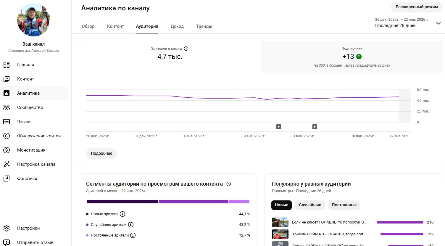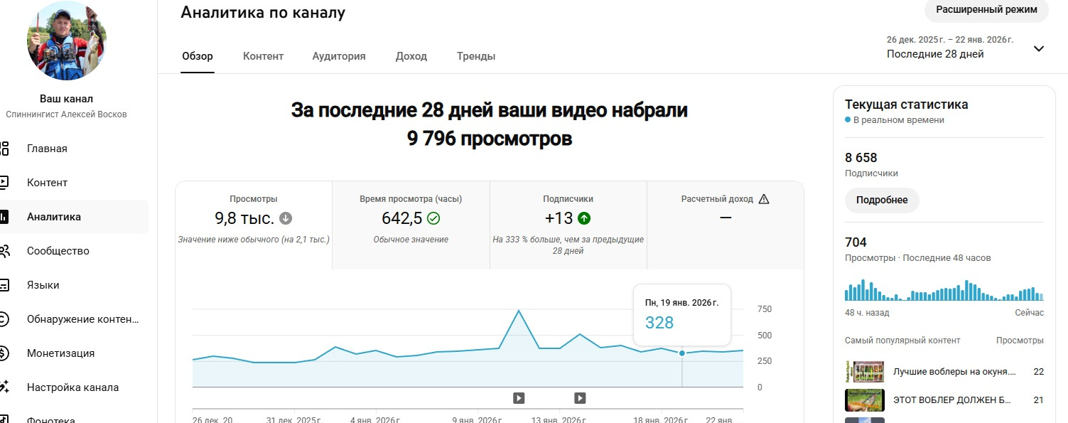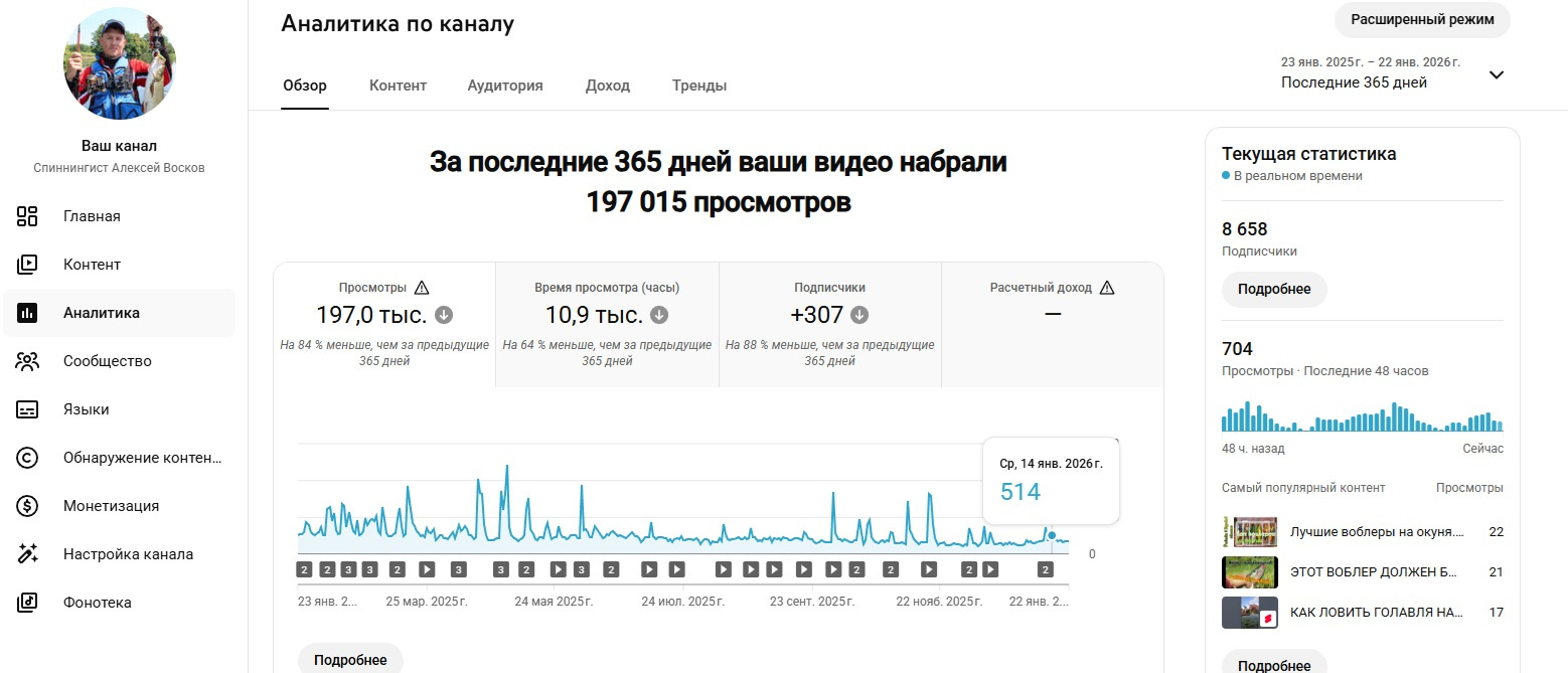 Рыболовный блог с качественными видео. Обзоры спиннингов, фидерных удилищ, поплавочных удочек, разнообразных рыболовных приманок и техника ловли всех видов рыб. Каналу 9 лет, 741 видео. Очень хорошо залетают шортсы, но перестал этим заниматься.Несколько лет назад до известных событий приносил хороший заработок во время монетизации Адсенс. Также благодаря каналу многие известные рыболовные бренды присылают свои снасти за бартер, т.е. вы тестируете, записываете видео обзоры, а снасти остаются в вашем владении. У автора канала теперь десятки спиннингов, катушек и т. Можете продавать и получать дополнительный заработок. Также записывал ролики за обговоренные суммы, в среднем 2 тыс. рублей. В последние три года канал принят в epn.bz и с оттуда идет основной официальный доход. Работает с Яндекс. Маркетом и Алиэкспресс, Максфишинг. Доход зависит от количество загружаемых видео. Последний год развиваю ВК сообщество, поэтому этому каналу посвящаю очень мало времени, соответственно падает и доход. В скринах добавил статистику за последние полгода и по месяцам. Можно увидеть, что в сезон заработок выше, но зависит в течение года исключительно от вашей активности. Рассмотрю предложения ниже оптимальной цены.