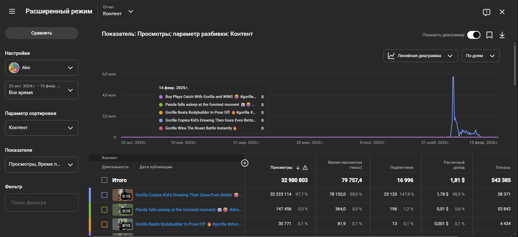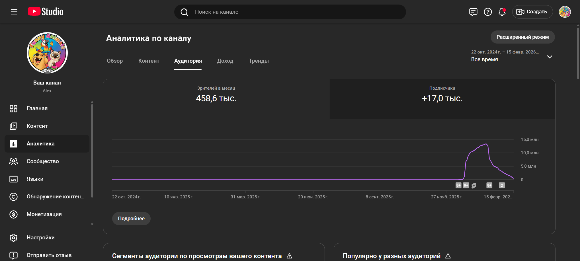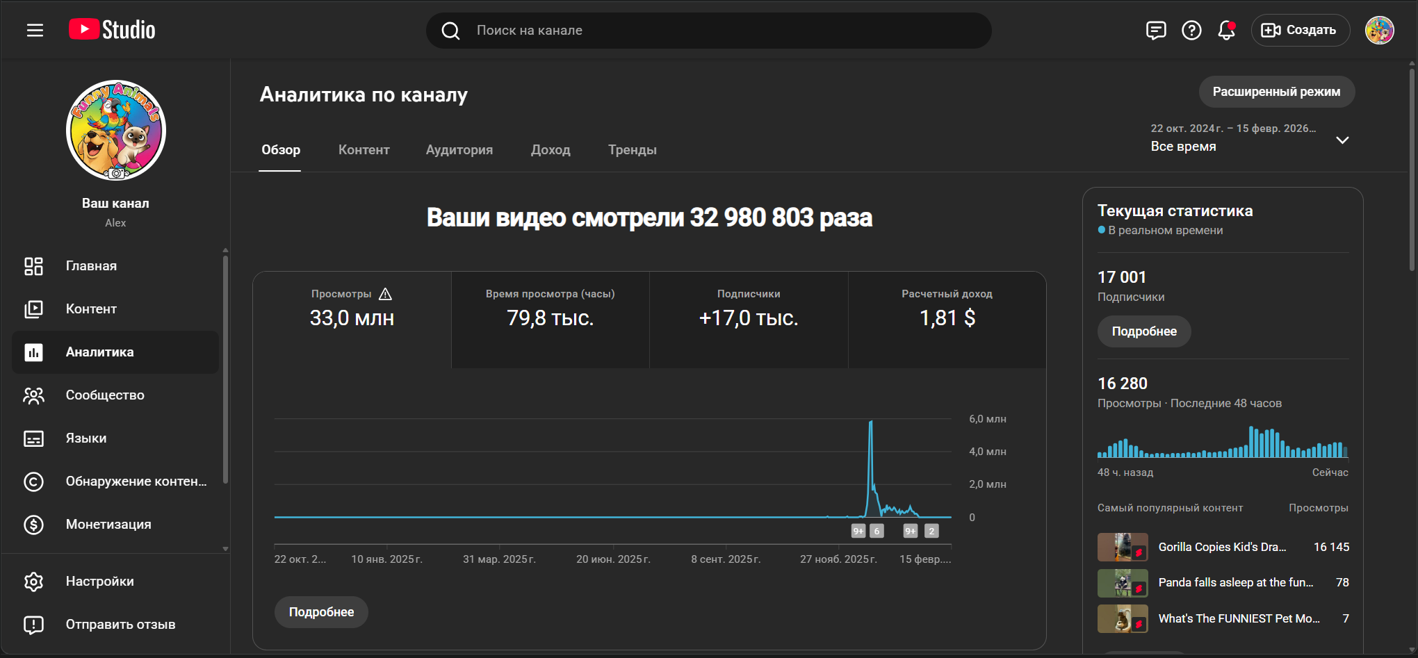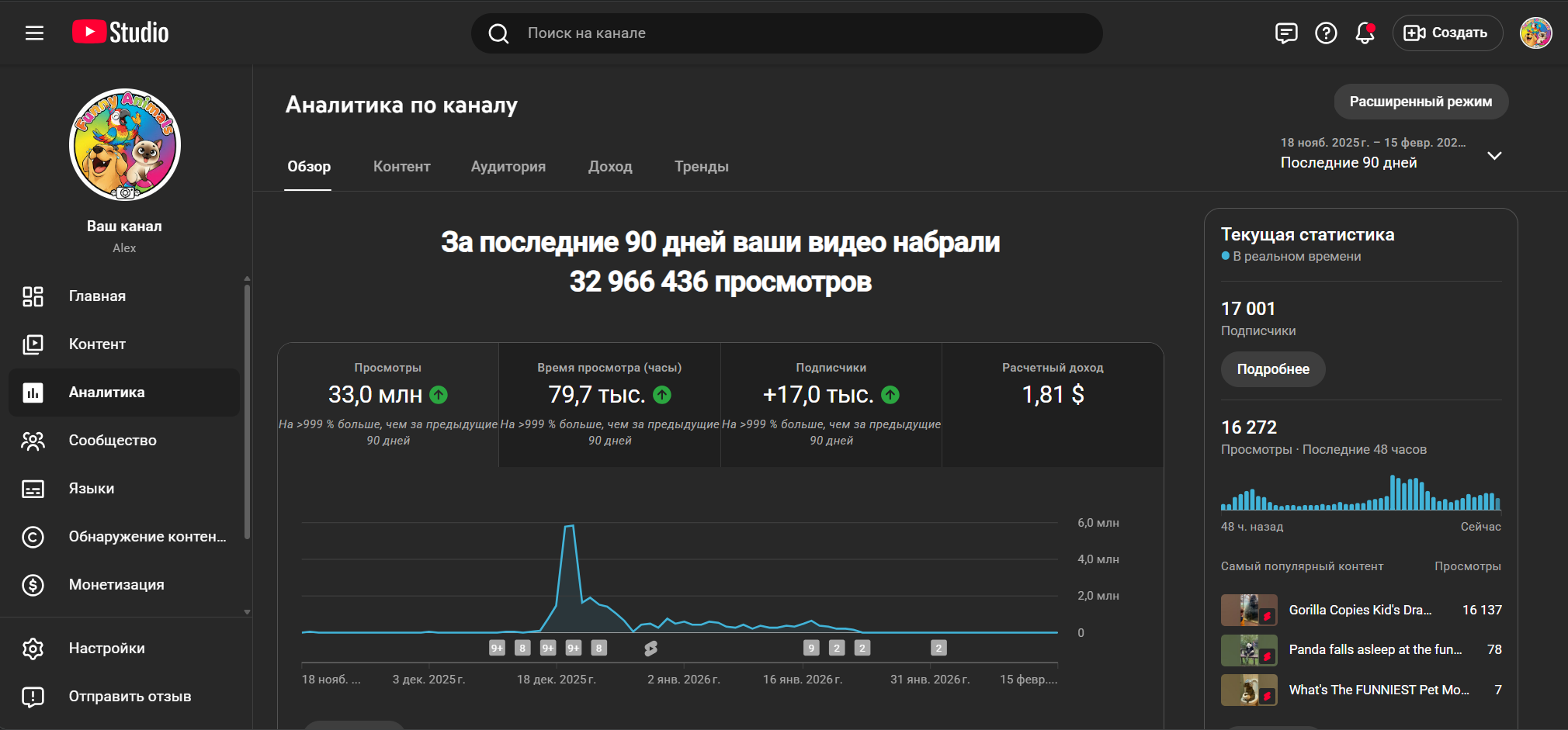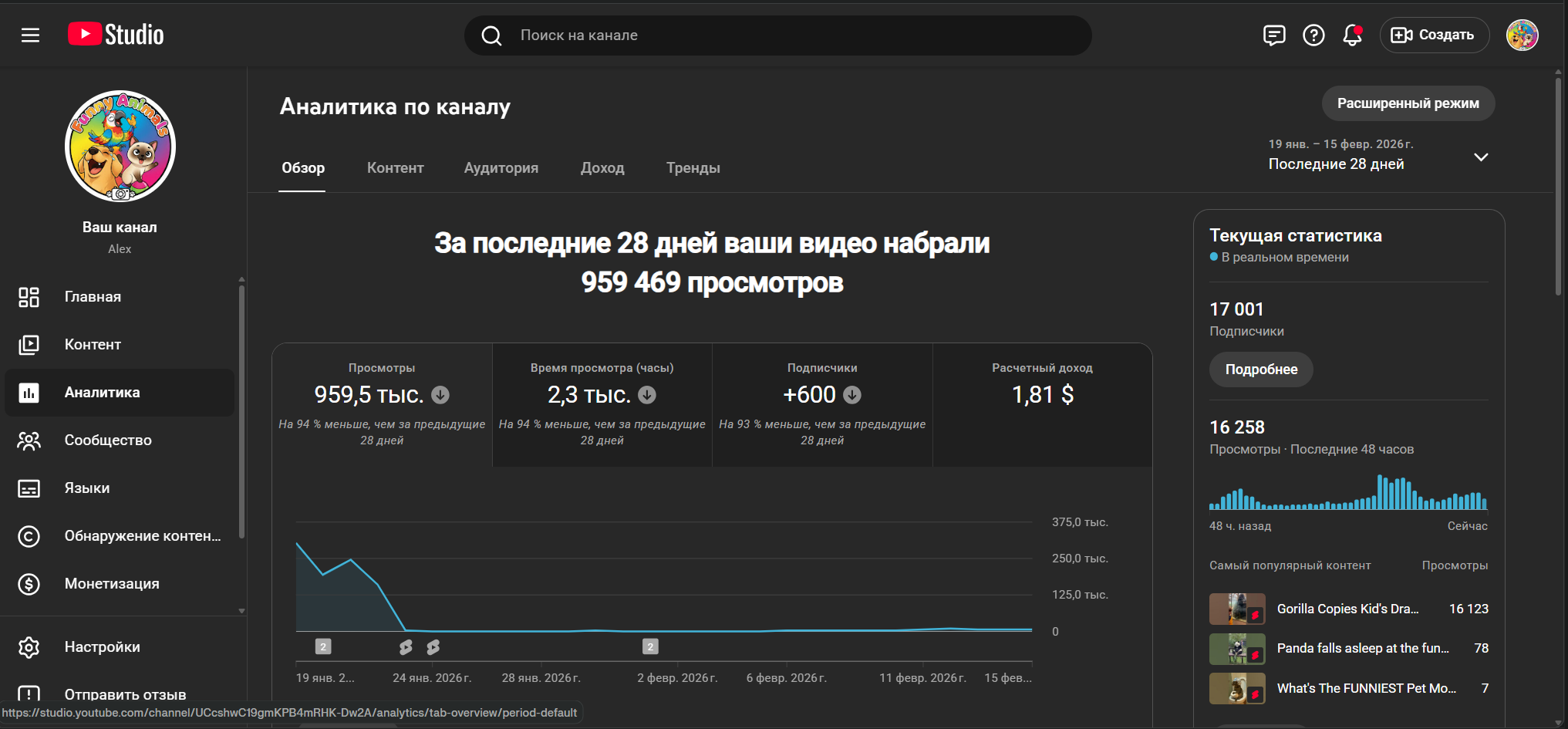 Этот проект привлечет покупателей стабильным ростом аудитории, как у успешных каналов с миллионами просмотров на похожие темы, простотой ведения — достаточно собирать и монтировать вирусные клипы, — и высоким потенциалом монетизации через рекламу и партнерства с брендами для животных. Готовый трафик и лояльные зрители обеспечат быстрый доход без стартовых вложений в раскрутку.