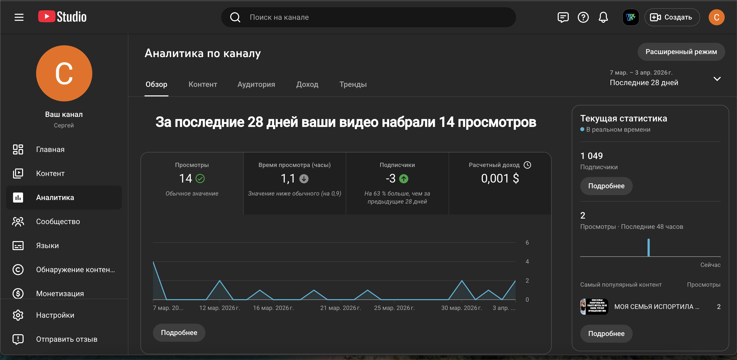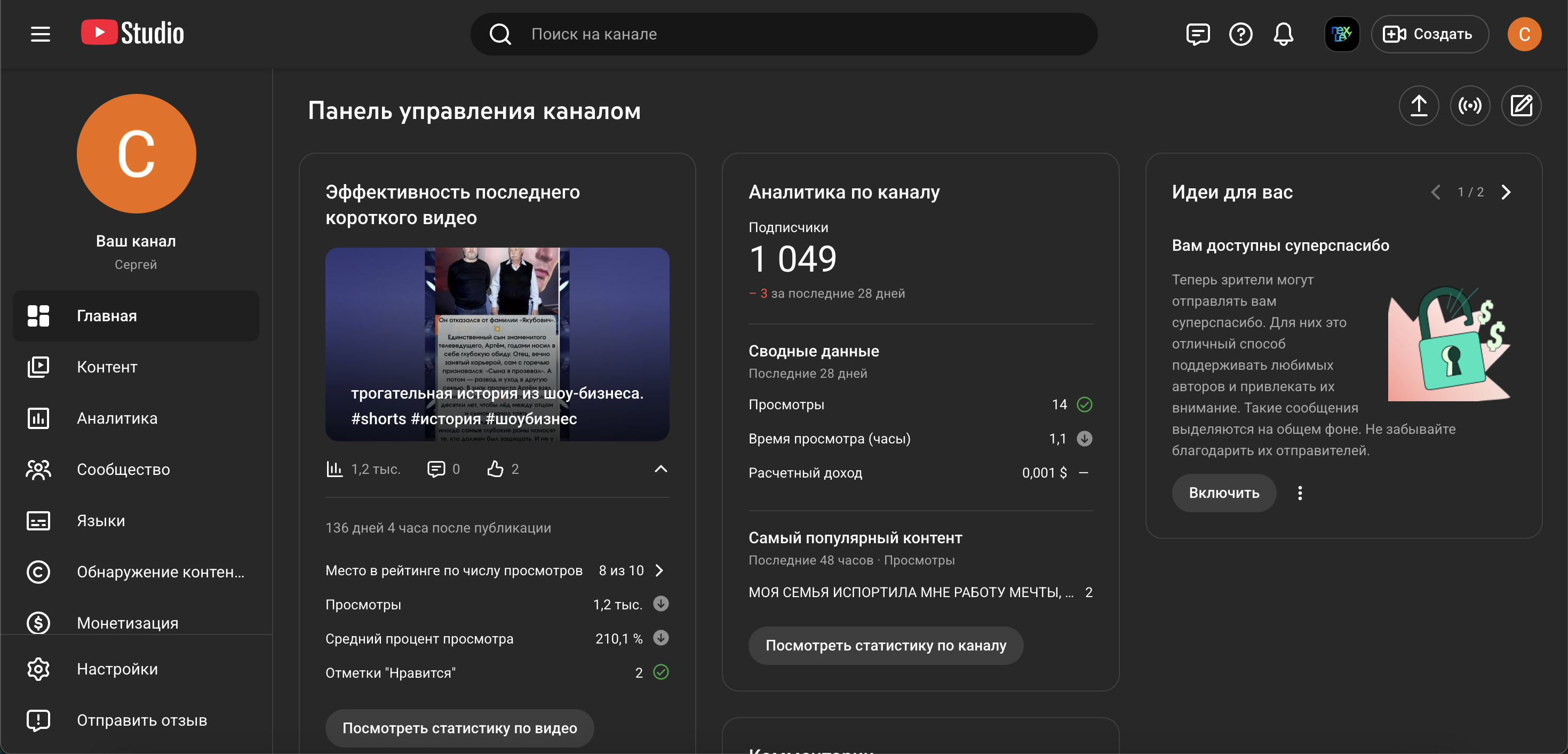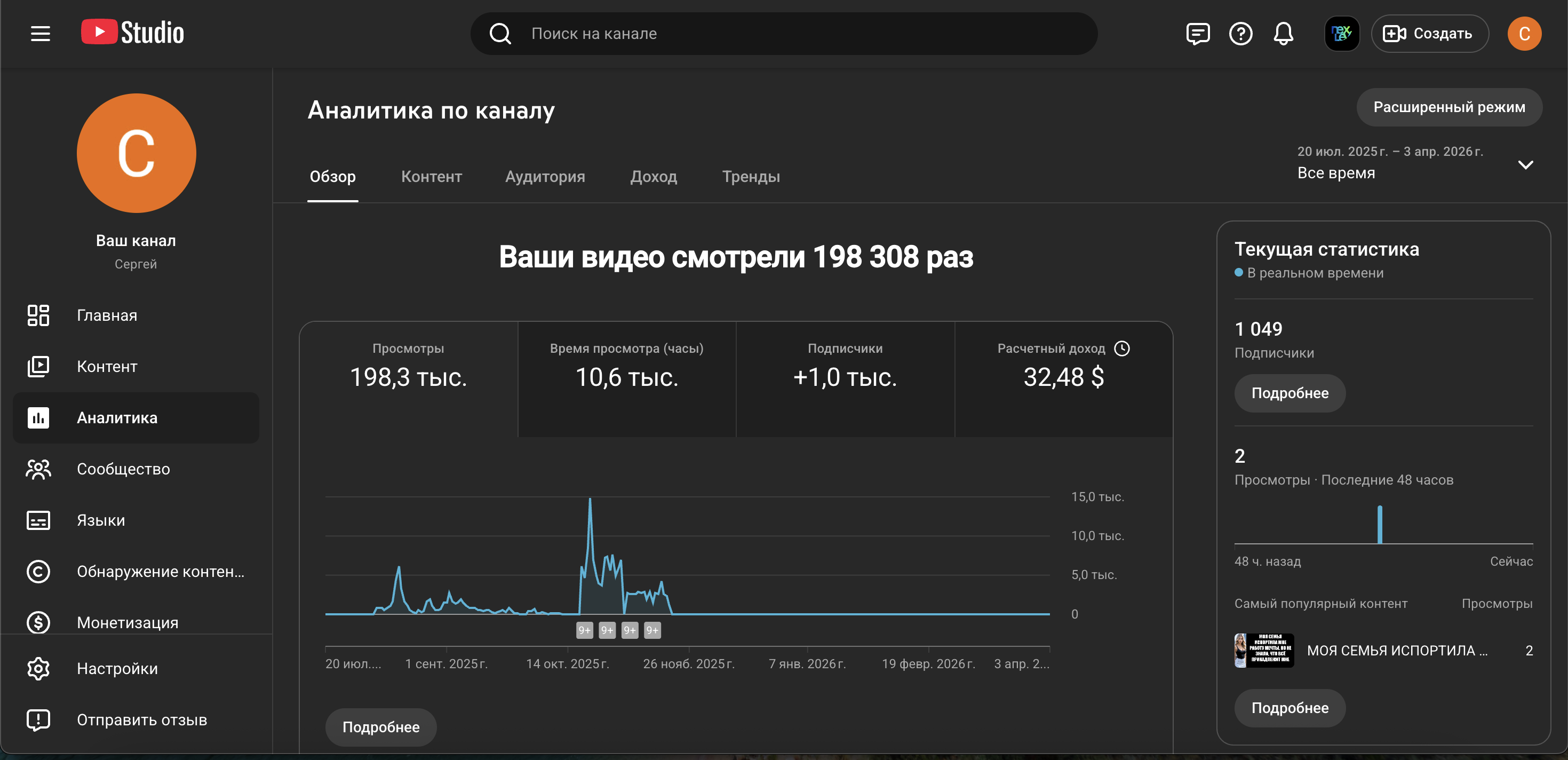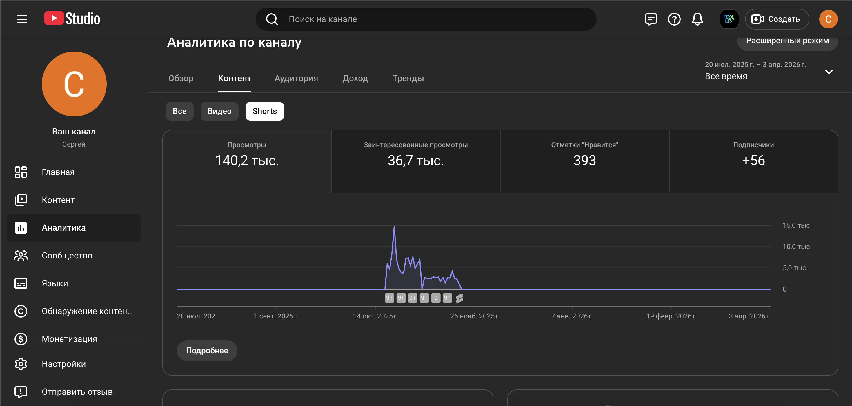 Продам ютуб канал с включенной монетизацией! Рост органический, трафик как и из лонг видео, так и из шортс.
