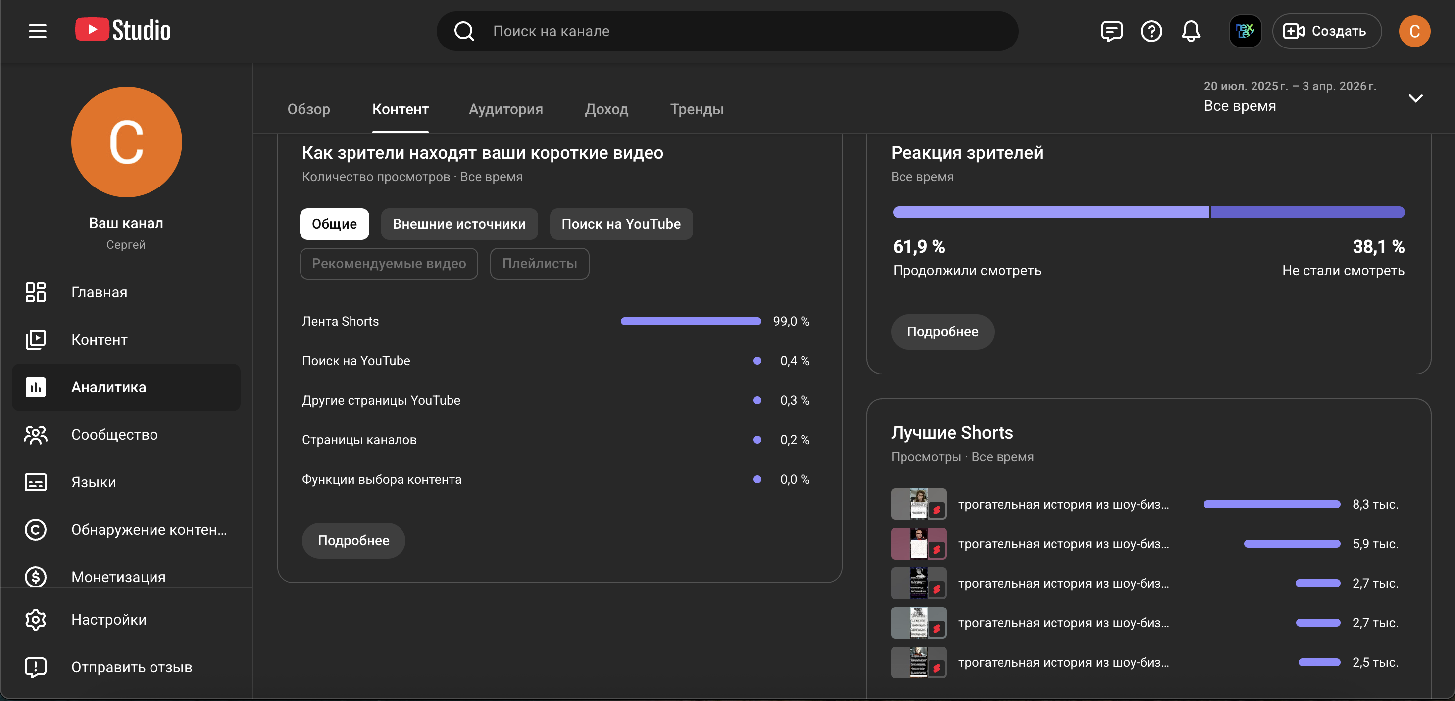 Канал без накруток, трафик из рекомендаций и функций выбора.