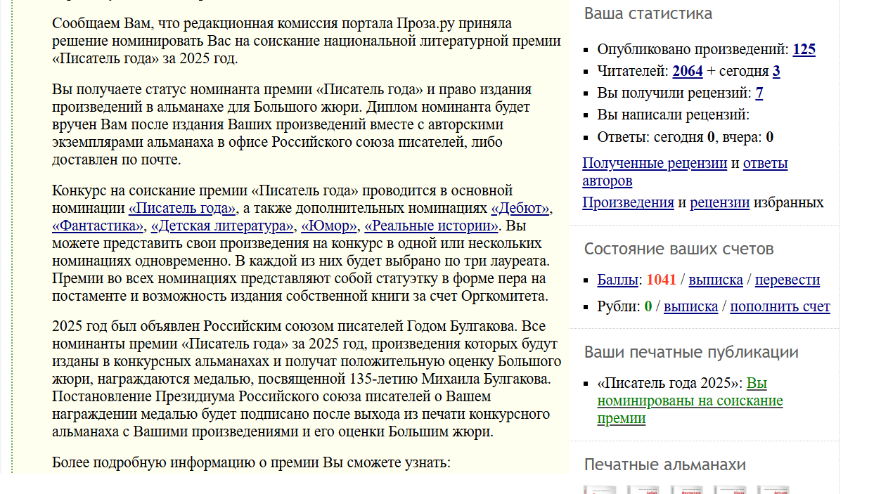 ✔️Вместе с каналом, если вам нужно, отдам аккаунт на Проза.ру. Там более 2000 подписчиков. Была номенирована на премию Писатель года 2025 года, не участвовала. (скрин прикрепила). Впишу ваше имя в авторские права.