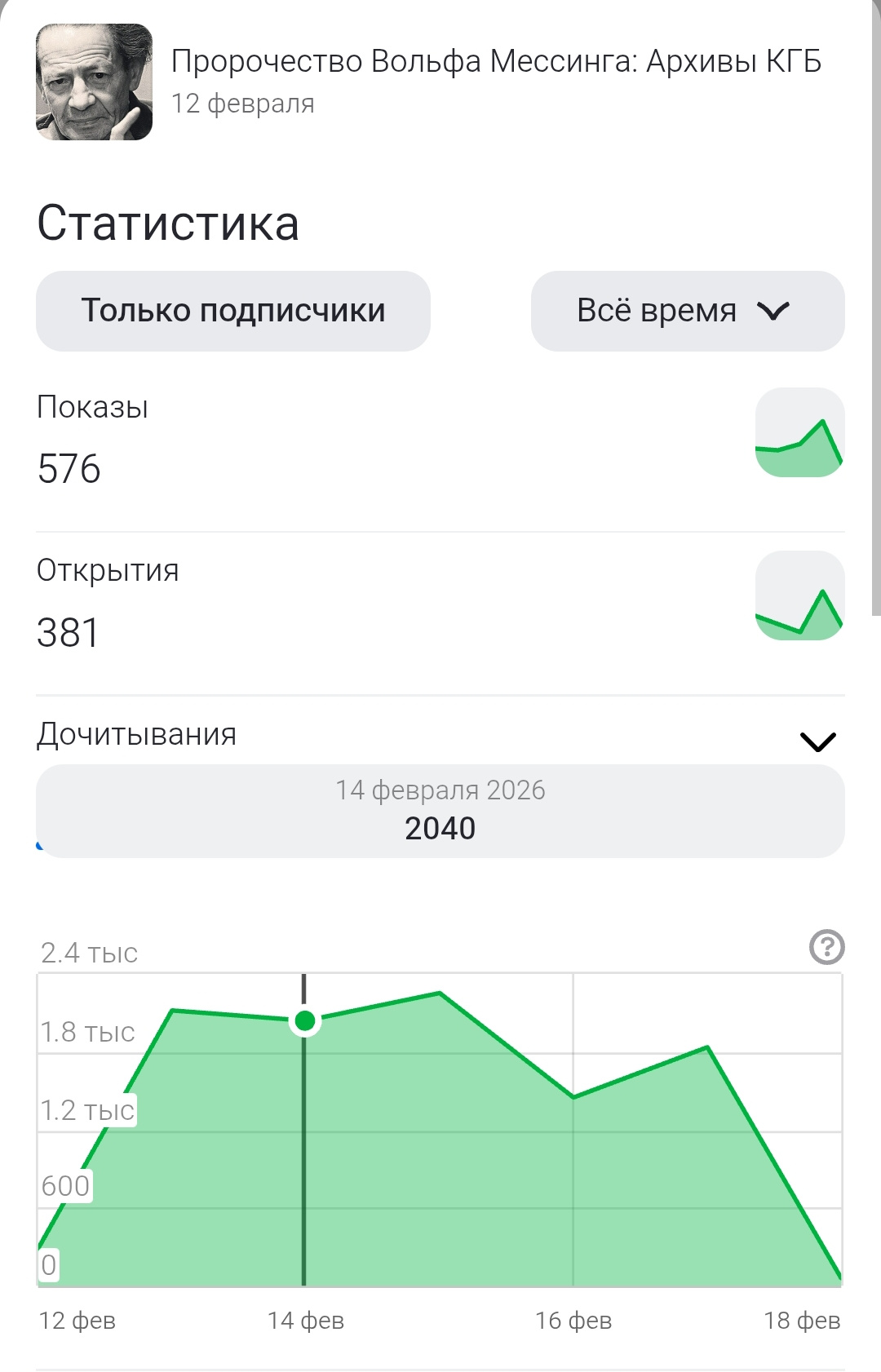 На данный момент 24.02.2026 статистика уже другая около 25.000 Дочитываний. В среднем так и держимся 1750-2100 в среднем дочитываний в сутки. Были дни как свыше 3000+ та и около 1450-1550. И свыше 450 подписчиков. Общий процент дочитываний на аккаунте свыше 88% идеальный показатель для топ каналов