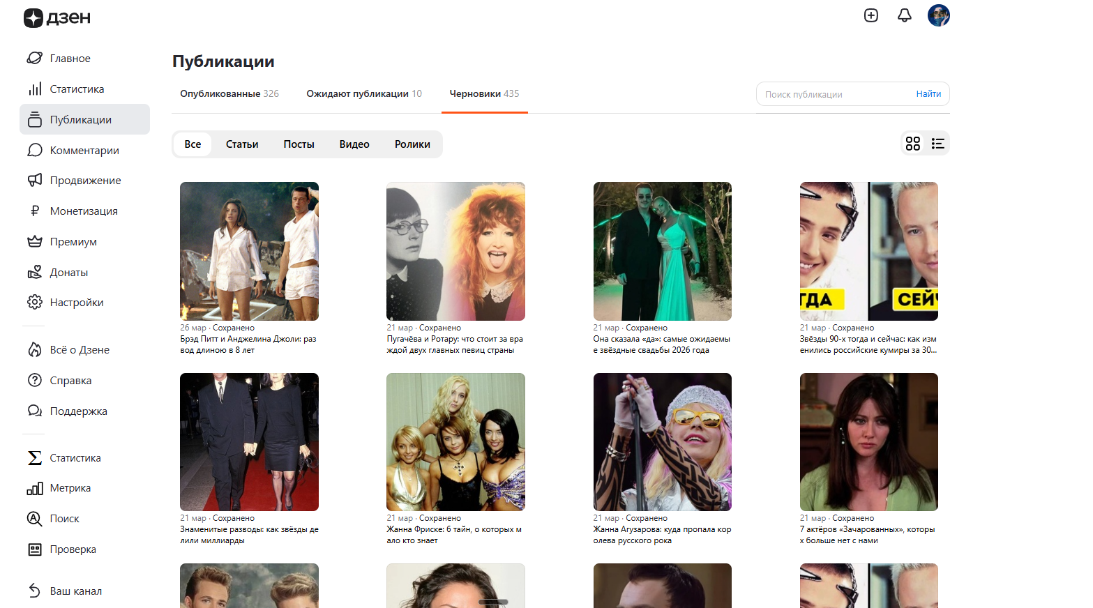 - Знаменитости и развлечения — 75% (судьбы актёров, закулисье сериалов, ностальгия 90-х/2000-х, скандалы, русские и турецкие звёзды, советское кино)