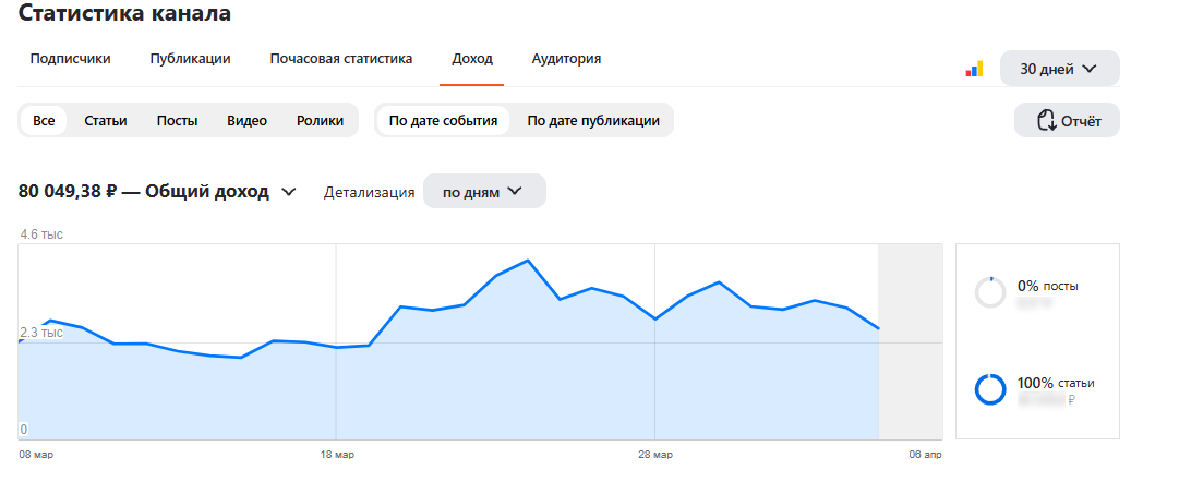Суммарный заработок более 3 млн. Пассивный доход вообще без постинга (на вечно-зеленых материалах) около 30 тыс. руб./мес. При активном постинге около 80 тыс. руб./мес. Регулярные донаты от читателей, премиум подписки.